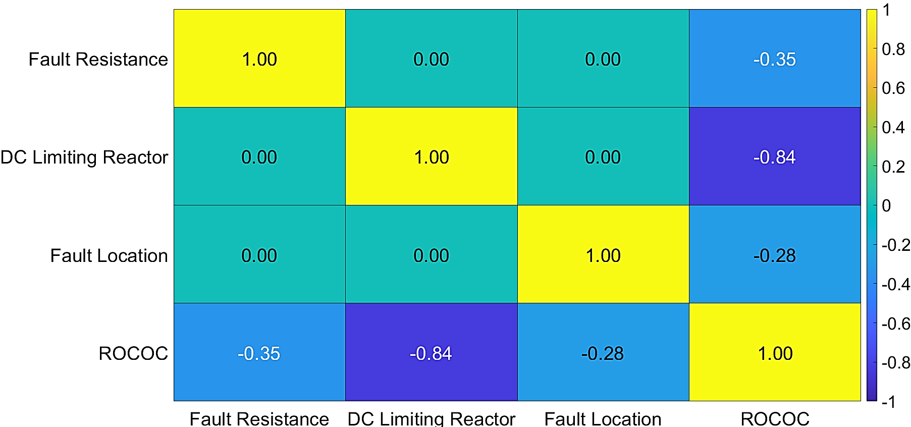 Pearson 상관계수 $r$은 두 연속형 변수 간의 선형 상관성을 나타내는 통계적 지표로 식 (12)에서 $x_{i}$는 독립 변수(고장 저항, DC Limiting Reactor, 고장 위치), $y_{i}$는 대응되는 ROCOC 값이며, $\overline{x},\: