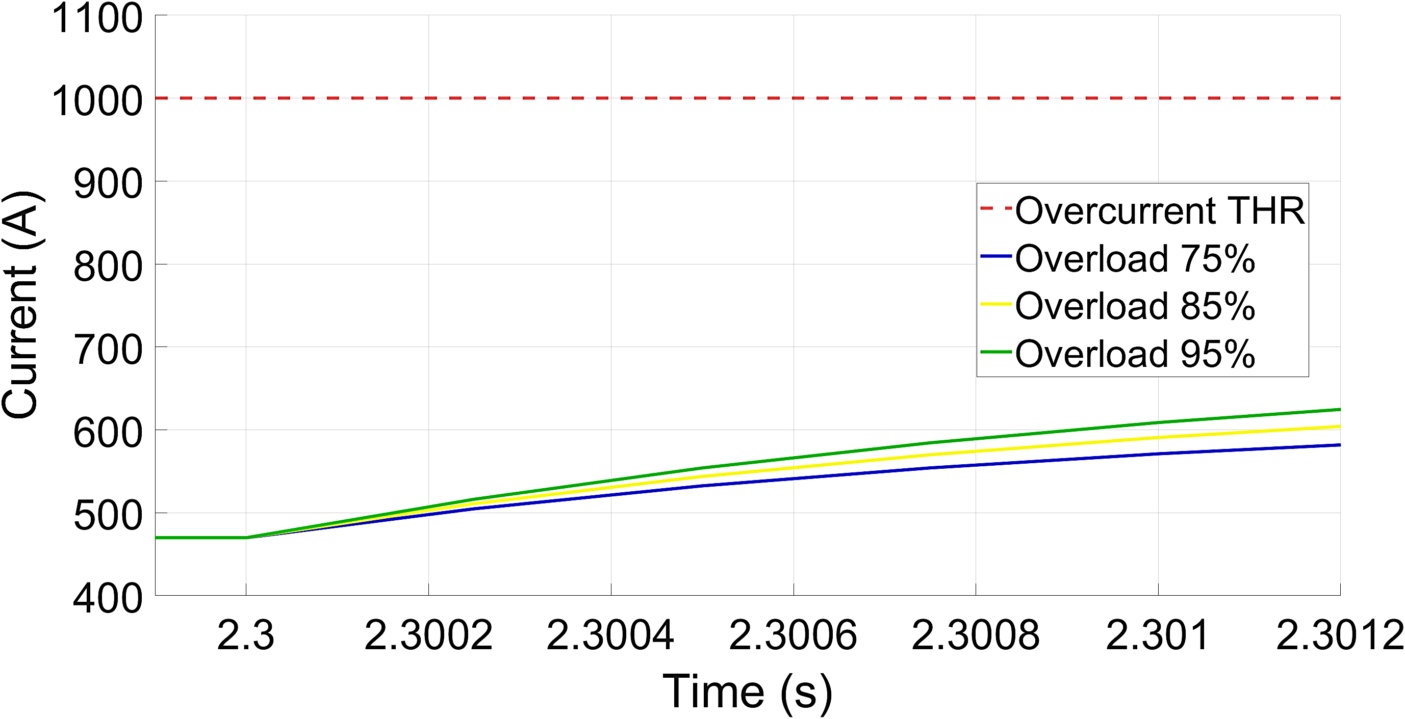 시간 지연 조건을 만족하지 않아 동작하지 않았다. 또한 DC 과전류 계전기의 경우에도 전체 부하 증가 조건에서 전류가 임계값에 도달하지 않아 고장으로