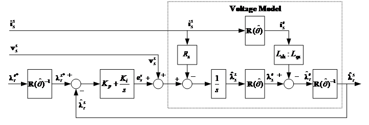 동기좌표계 d-q축 전압방정식은 다음과 같다.