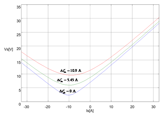 식(7)의 의미를 다시 살펴보면 동일 속도, 동일 토크지령에서 식(7)보다 큰 동기좌표계 d축 전류를 인가하게 되면, 항상 고정자전압의 크기가 증가함을 의미한다. 동기좌표계 d축 전류의 증가로 인하여 고정자전류의 크기가