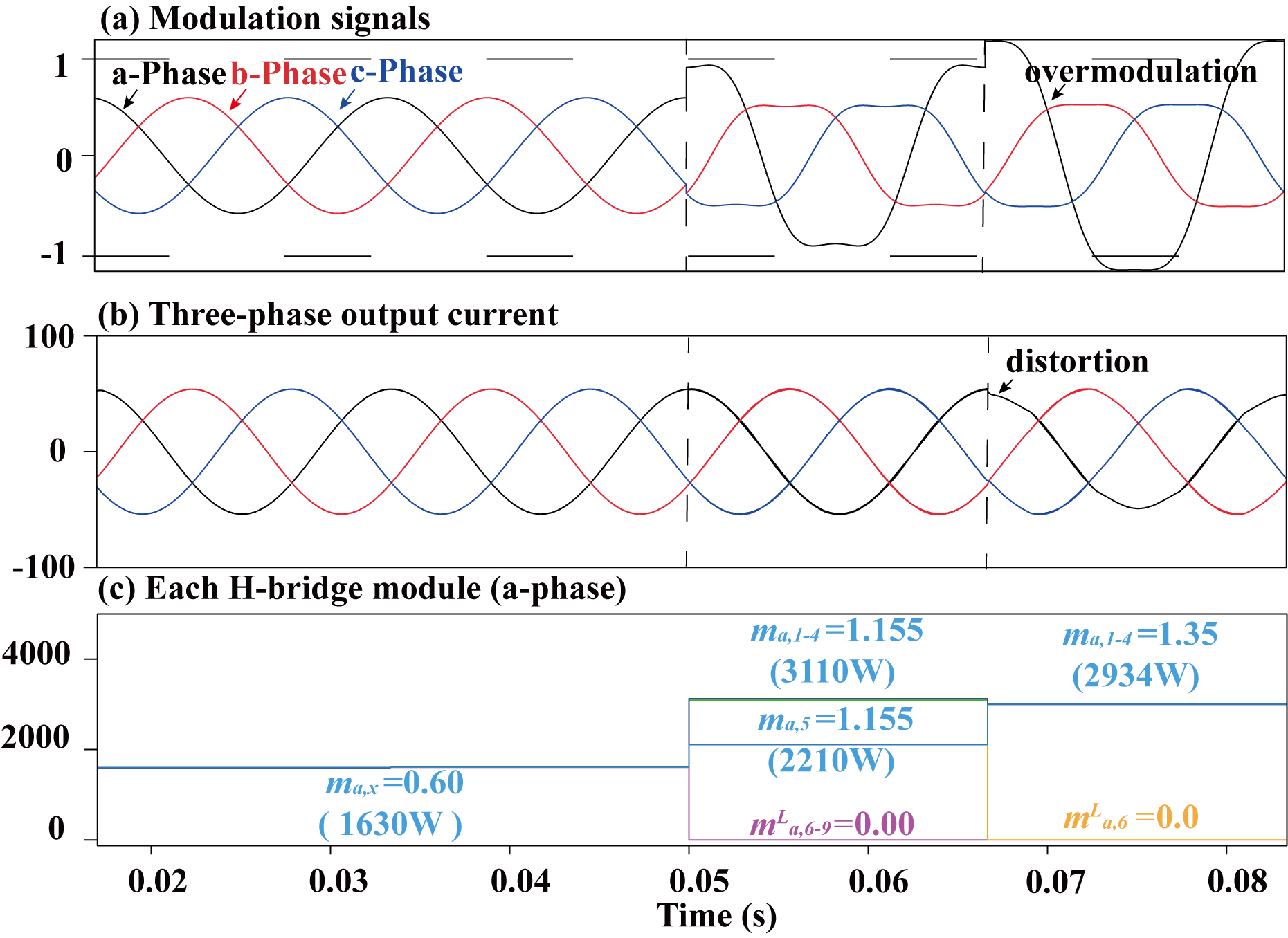 signal, (b) Output current, and (c) Output power of each module in phase a