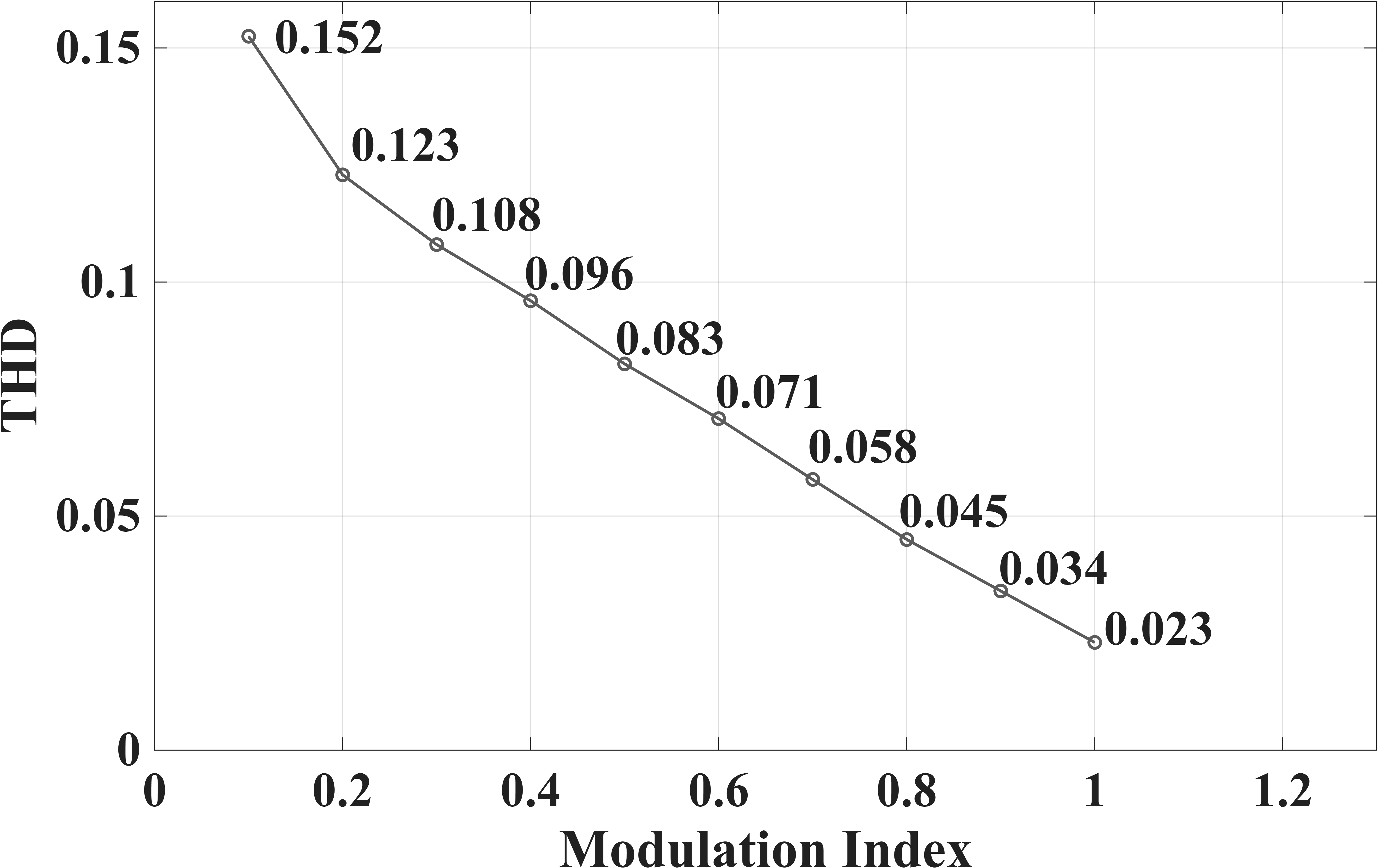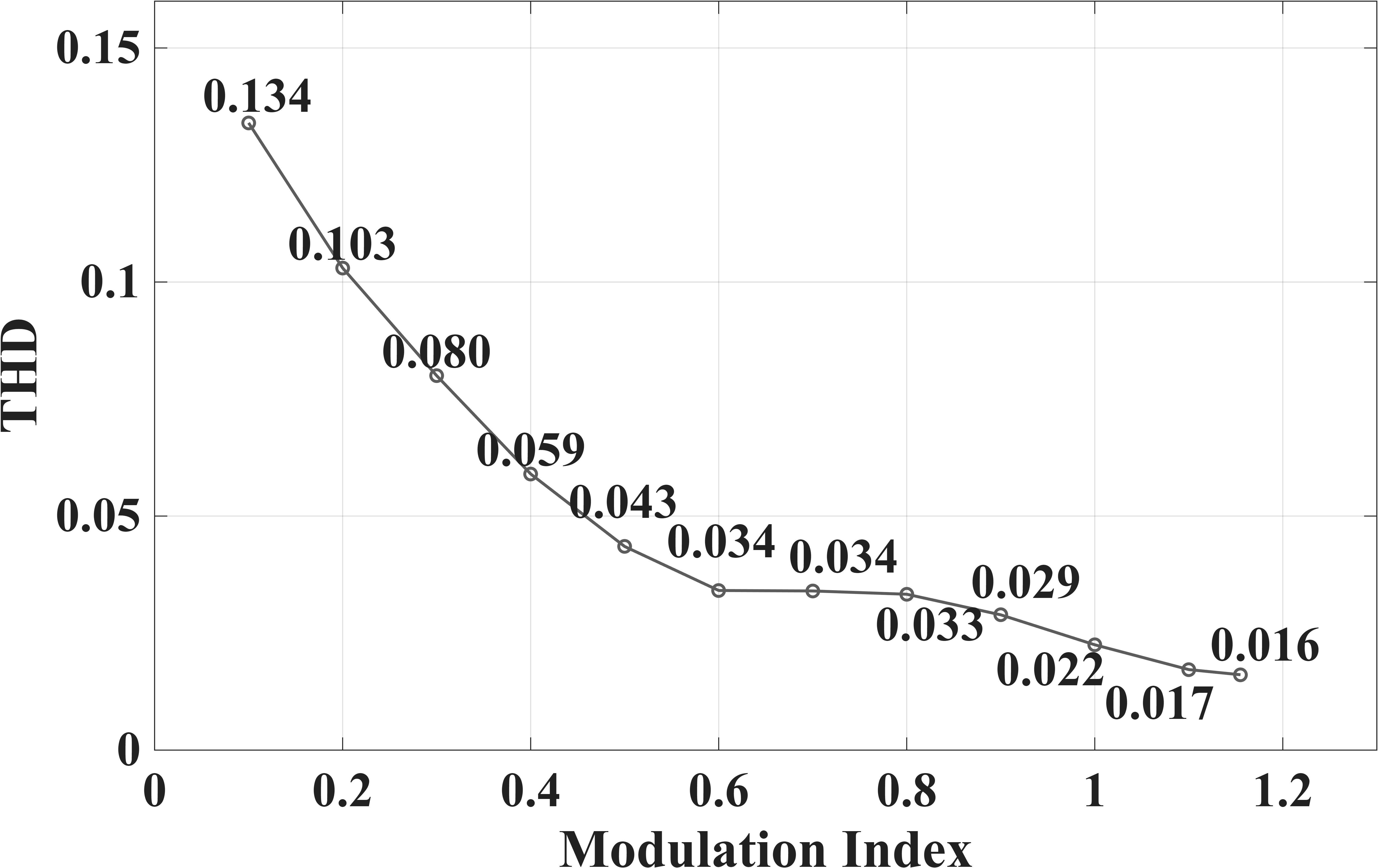 ๊ฐ์ฅ ๋๊ฒ ๋ํ๋๋ฉฐ, ๋ณ์กฐ์ง์๊ฐ 1.0์ ๋๋ฌํ๋ฉด 2.3%๋ก ๊ธ๊ฒฉํ ๊ฐ์ํ๋ค. ์ด๋ SPWM ๊ธฐ๋ฒ์ด ์ถฉ๋ถํ ํฌ๊ธฐ์์ ๋ณ์กฐ๋์ด์ผ ์ ํํ์ ๊ฐ๊น์ด ์ ์์