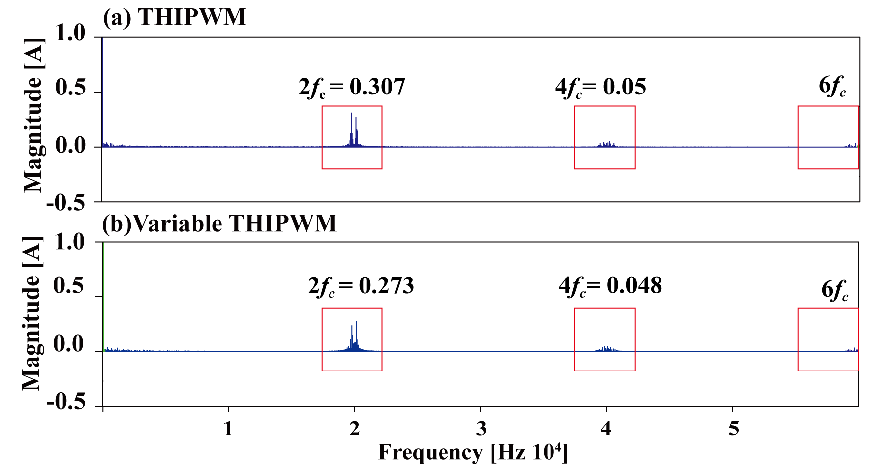์ฃผํ์ ์คํํธ๋ผ์์๋ 2์ฐจ ๋ฐ 4์ฐจ ๊ณ ์กฐํ๊ฐ ์ผ๋ถ ๊ฐ์ํจ์ ํ์ธํ ์ ์๋ค. ๊ทธ๋ฆผ 25 (c) DPWM ๊ธฐ๋ฒ์ ๊ฒฝ์ฐ 2์ฐจ ๊ณ ์กฐํ๊ฐ ๋ ๊ฐ์ง THIPWM ๊ธฐ๋ฒ ๋๋น ๋ฎ๊ฒ ๋ํ๋๋ค. ์ฌ๊ธฐ์ ์ถ๋ ฅ ์ ๋ฅ์ THD๋ THIPWM ๊ฒฝ์ฐ 4.19%, ๊ฐ๋ณ