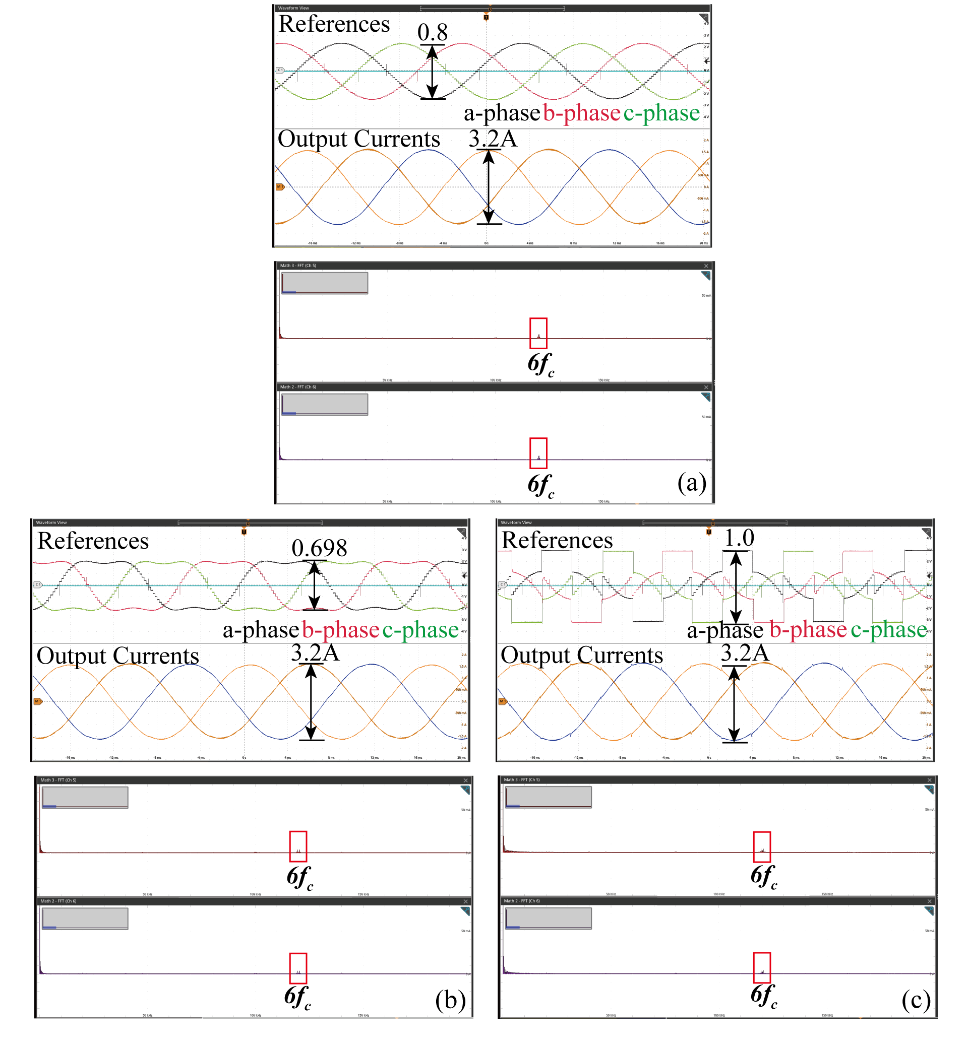 Fig. 25. Reference signals, output currents, and frequency spectra of the three-phase