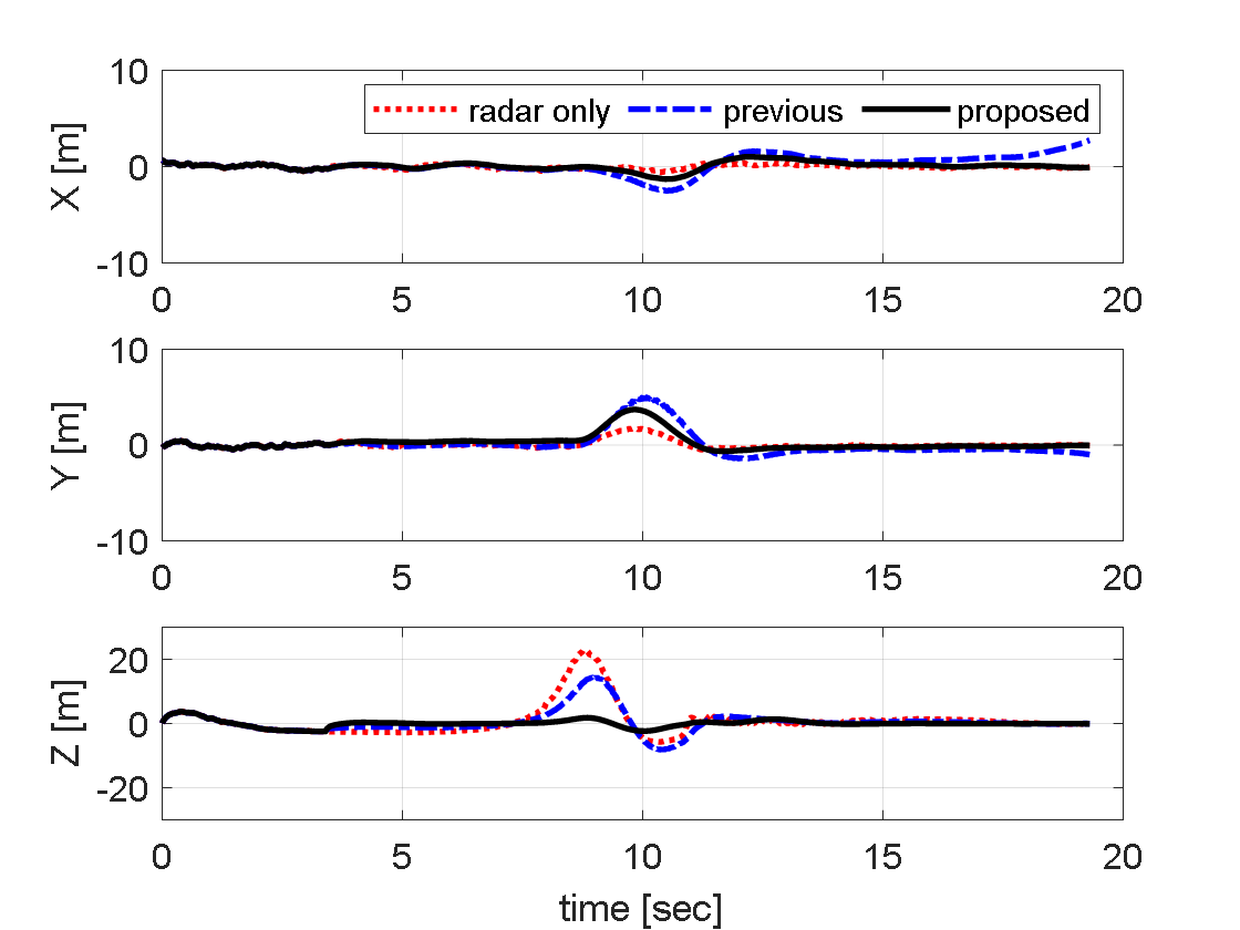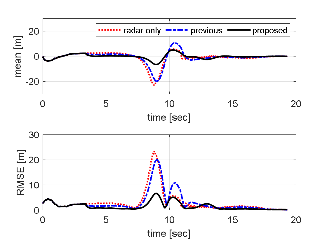 기인한다. 반면, 기존 OOSM 필터는 전자광학 센서가 제공하는 양질의 정보를 역전파를 통해 단회성으로만 융합하기 때문에, 레이더 측정치의 편향 오차가