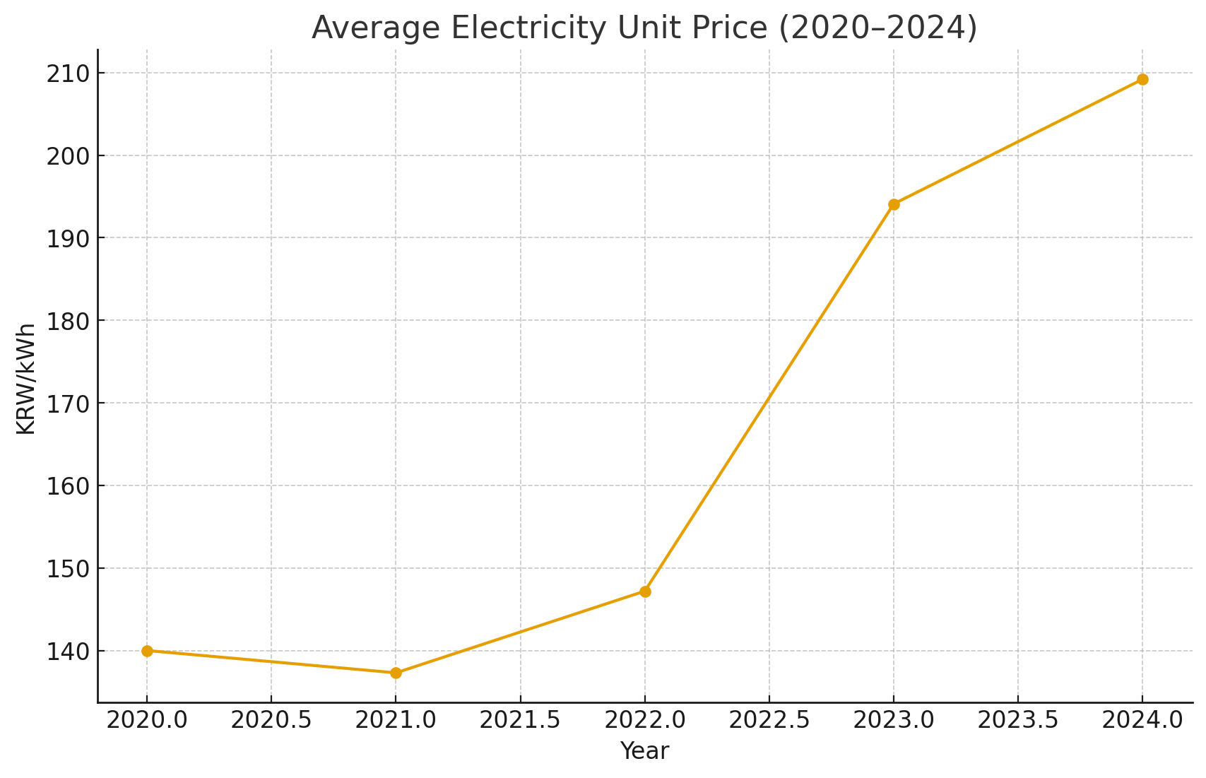 반등하였다. 그러나 전력 요금의 상승 폭은 더 가팔라 2023년에 전년 대비 +102.6%를 보였고, 2024년에도 +13.5% 추가 상승하였다.
