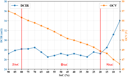 반면 중SoC(20~80%) 구간에서는 충·방전에서 가장 안정적인 내부저항 특성을 보였다.