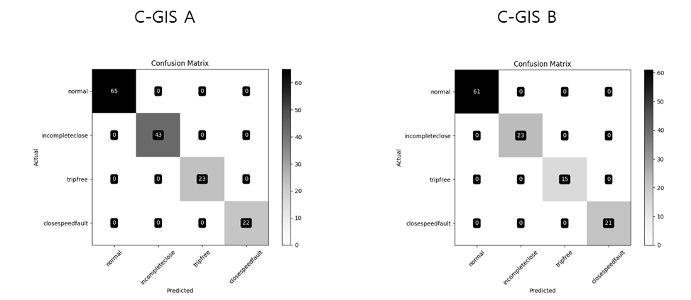 결함 분류를 진행하였다. 실험에는 두 개의 C-GIS인 C-GIS A와 C-GIS B에서 센서 종류 및 센서 설치 위치에 따른 총 4개의 센서를 이용해