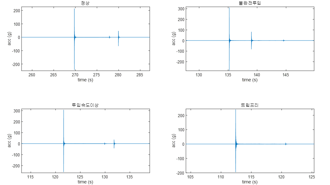 시계열 데이터를 그대로 시간 축에서만 비교하게 되면, Fig. 8과 같이 결함 별 차이가 두드러지게 나타나지 않는다.