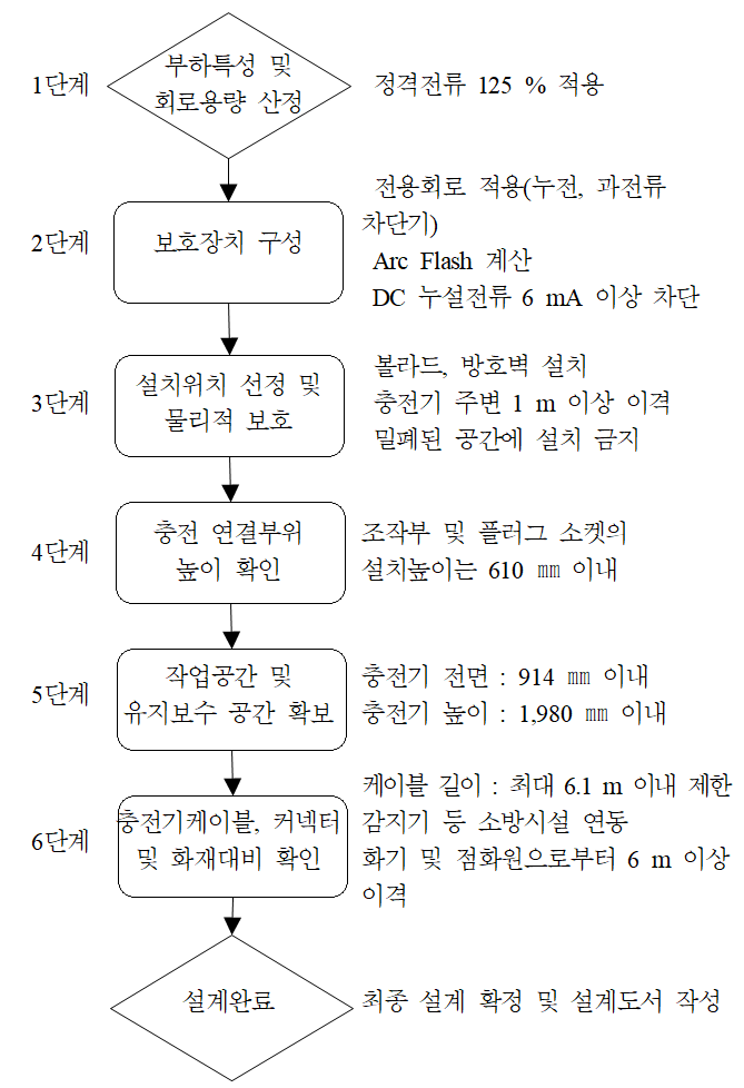 것이 검토되어야 한다. Fig. 3은 KEC 기준의 개선안에 대해 전기자동차 충전장치 설계에 대한 Flow Chart를 나타내고 있다.