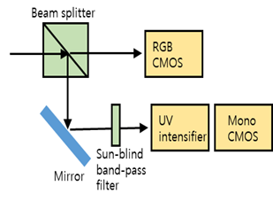 가시광선 카메라 영상들 사이의 위치 관계가 피사체의 거리와 상관없이 일정하게 하기 위하여 그림 1과 같이 자외선 카메라와 가시광선 카메라의 입사광은 일축(동축)을 이룬다.