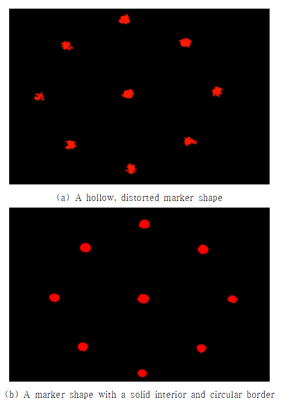 보면 마커의 속이 비어 있거나 바깥 경계가 찌그러져 있어 마커의 중심 좌표를 찾기 어렵다. 이를 해결하고자 본 논문에서는 잡음이 제거된 여러 장의