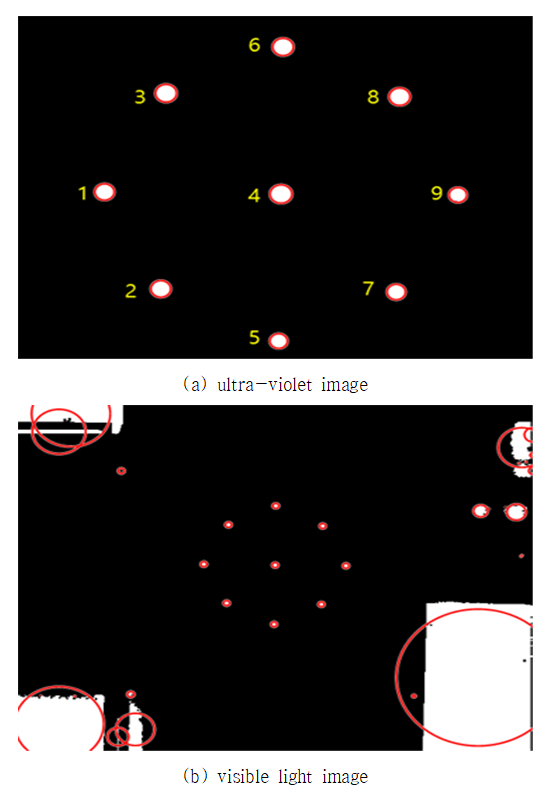 3단계(특징점 검출)에서는 자외선 영상과 가시광선 영상에 있는 원형 마커들의 중심 좌표를 각각의 영상으로부터 추출한다.