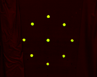 9 개의 원형 마커들이 방사형으로 배치되어 있고, 위, 아래에 위치한 2 개의 마커는 자외선 카메라의 수직방향 최대 화각 근방에 놓여 있다.
