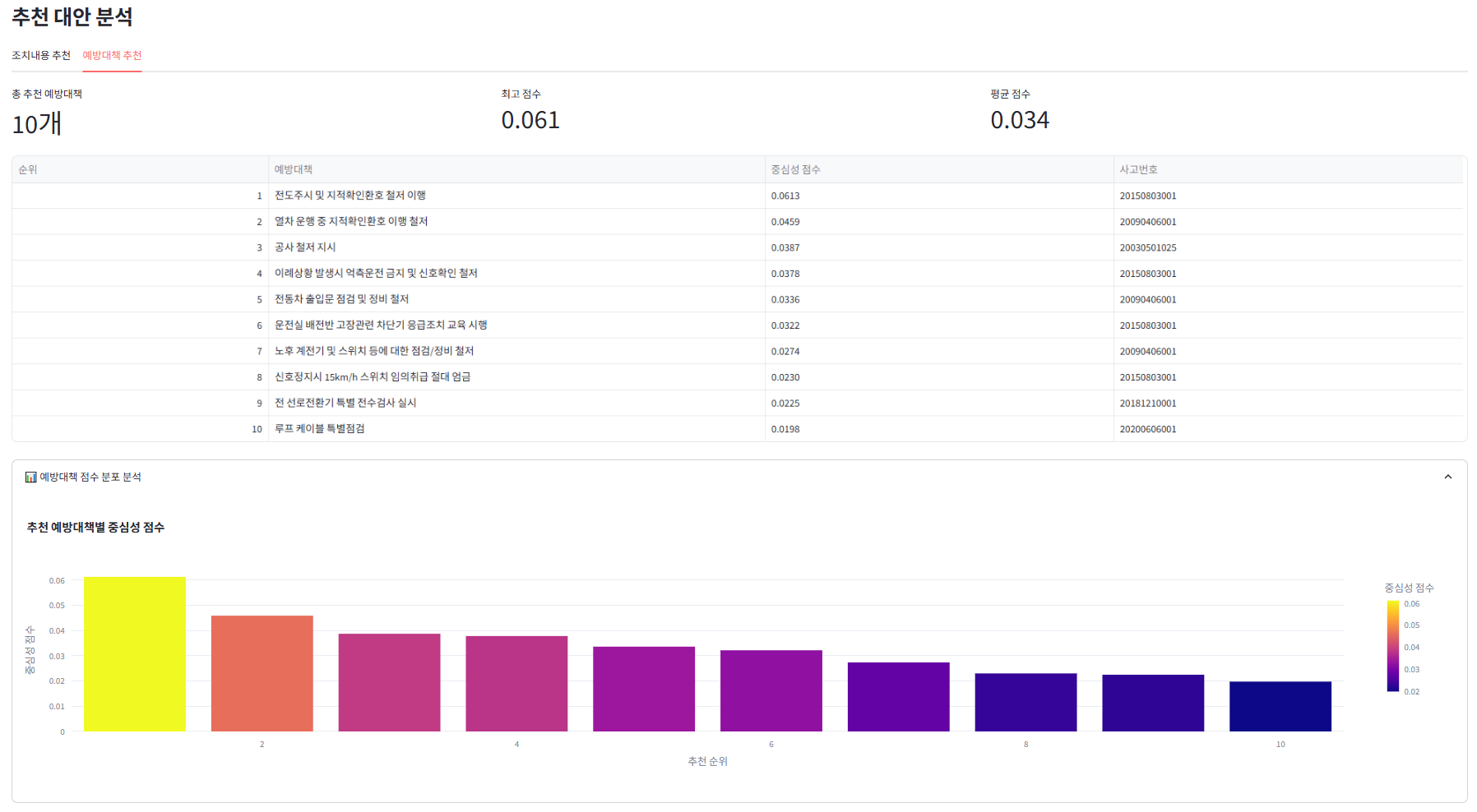지원한다. 대안 추천 알고리즘은 유사한 사고 사례에서 도출된 조치/대책을 의미적으로 비교·평가해 상위 10개를 추천하는 것을 확인하였다. 사고유형