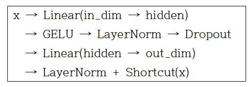 완전연결층을 추가하여 더 복잡한 비선형 변환을 표현하고 풍부한 특징을 추출하고, Residual Shortcut을 통해 본래 임베딩 정보와 학습된