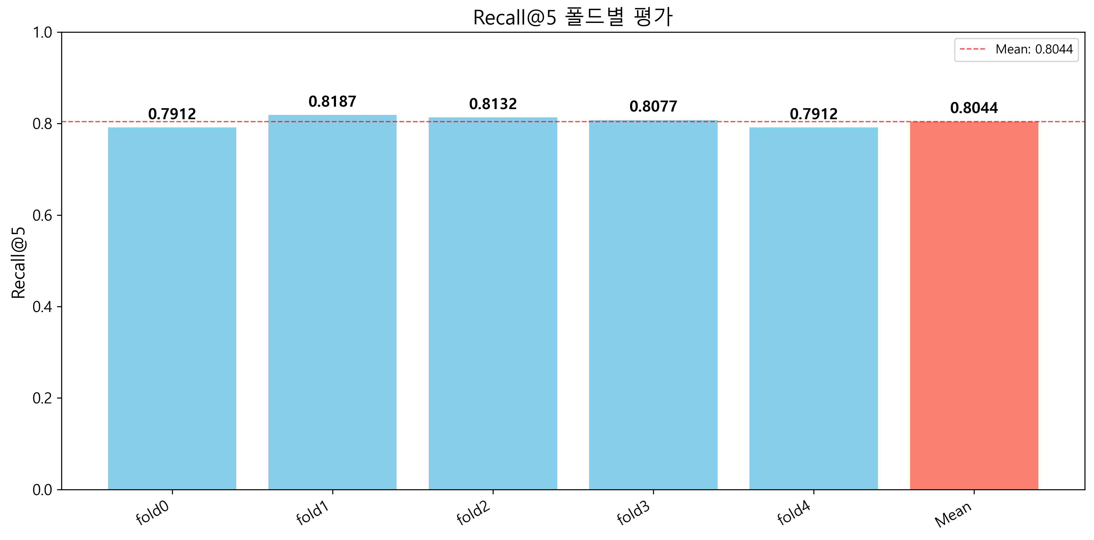 결과를 평균화하여 모델의 전체 성능을 대푯값으로 도출하였다. Recall@5와 5-fold 기반 성능검증 결과, 80.4%로 평가된 것을 확인 할