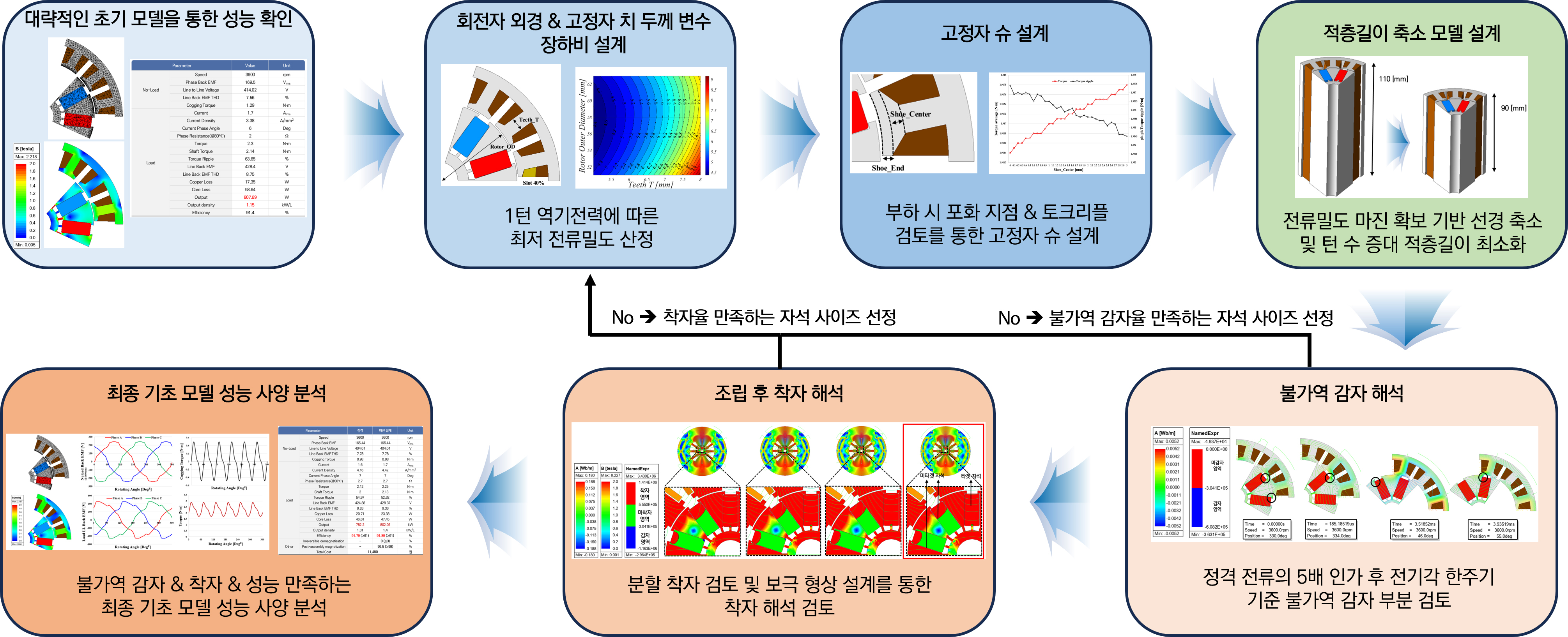 ์๊ตฌ์์ ๋ชจํฐ์ ๊ธฐ์ด ์ค๊ณ ํ๋ก์ธ์ค๋ฅผ ๋จ๊ณ์ ์ผ๋ก ๋ํ๋ธ ๊ฒ์ด๋ค. ๋จผ์ , ์ด๊ธฐ ๋ชจ๋ธ์ ๋์์ผ๋ก FEA ํด์์ ํตํด ๋๋ต์ ์ธ