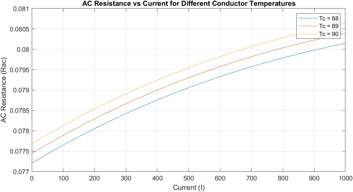 Fig. 1. AC resistance vs current for different conductor temperatures