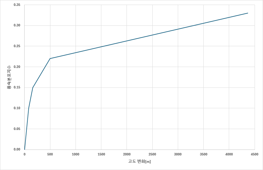 ๊ทธ๋ฆผ 2๋ 4๋จ๊ณ๋ก ๊ตฌ๋ถ๋ ์กฐ๋ ๋ฐ ํ์๊ณ ๋๋ถํฌ์ง์์ ์ ์ฉ์ผ๋ก ๊ณ ๋๋ณ๋ก ๊ธ๊ฒฉํ๊ฒ ํ์์ด ์ฆ๊ฐํ๋ ๊ฒ์ ์ ํํ๊ธฐ ์ํด ํ 4์ ํ์๋ถํฌ์ง์๋ฅผ ํ 5์ ํ์์ง์ ๋ถ๋ฅ ๊ธฐ์ค์ธ 0 โ 4367 m ๊ณ ๋๋ก ์ฌ์ฐ์ ํ ๊ทธ๋ฆผ์ด๋ค.