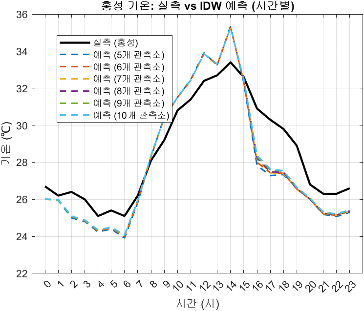 km ๋ฏธ๋ง์ ์์นํ ๊ธฐ์๊ด์ธก์์ ์ธก์ ์ ๋ณด์ ํ์ฉ, ์ด ๊ฐ๋ค์ ๊ฐ๊ณต ์ก์ ์ ๋ก ์์น๋ก ๋ณด์ ํ๊ธฐ ์ํด ์ญ๊ฑฐ๋ฆฌ๊ฐ์ค๋ฒ (IDW, Inverse Distance