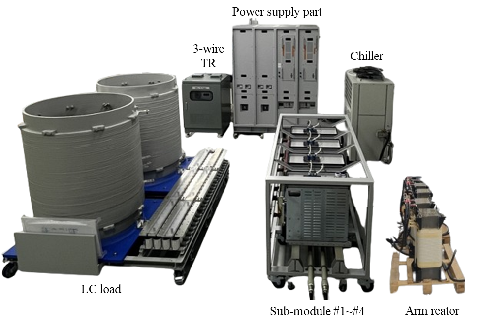 위상 전압을 형성한다. 계단형 출력 전압을 형성하기 위해 스위칭 패턴에 따라 SM은 불연속적인 전류가 흐르며, 전류의 방향과 크기가 지속적으로 변한다[7]. 즉, SM의 성능 평가를 위해서는 실제 운전 상황에서와 동일하게 스위치 도통 구간 및 스위칭 시점 전류를 재현하는 것이 필요하다[8]. 따라서, MVDC-MVDC 컨버터스테이션의 SM의 성능 평가를 위한 전력변환시스템의 필요성을 확인할 수 있다[9].