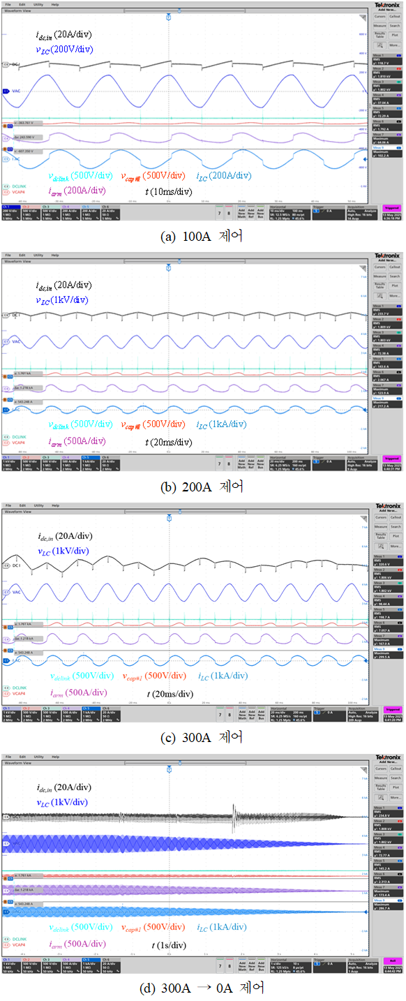 경우, SM의 빠른 과도 응답 특성이 아닌 정상상태에서의 동작 확인을 목적으로 개발되었기 때문에 공진 전류 제어의 대역폭이 매우 낮다. 따라서 그림 14(d)에서 볼 수 있듯, 전류 지령값이 변하는 경우에도 안정적으로 공진전류가 제어됨을 확인할 수 있다. 또한, 모든 상황에서 TP의 입력 전압인 vdclink