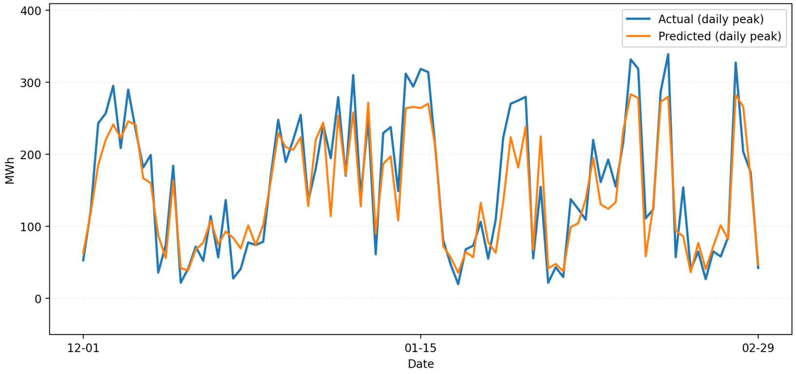 Fig. 10. Daily Peak: Actual vs. Predicted โ Winter