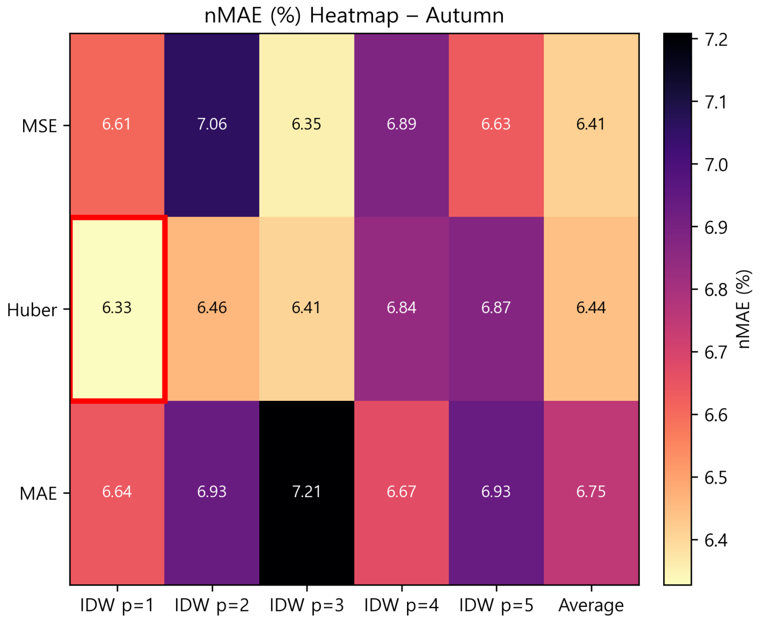 ๋ฐ Pseudo-Huber, ๊ฐ์์ IDW p=1 ๋ฐ Pseudo-Huber, ๊ฒจ์ธ์ IDW p=4 ๋ฐ MAE๊ฐ ๊ฐ๊ฐ ์ต์ nMAE๋ฅผ ๋ณด์๋ค. ์ด๋