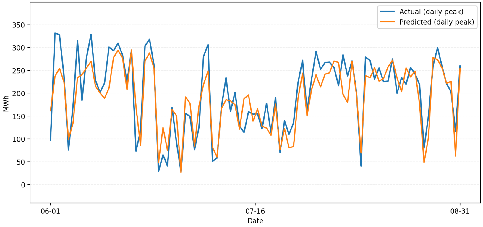 Fig. 8. Daily Peak: Actual vs. Predicted โ Summer