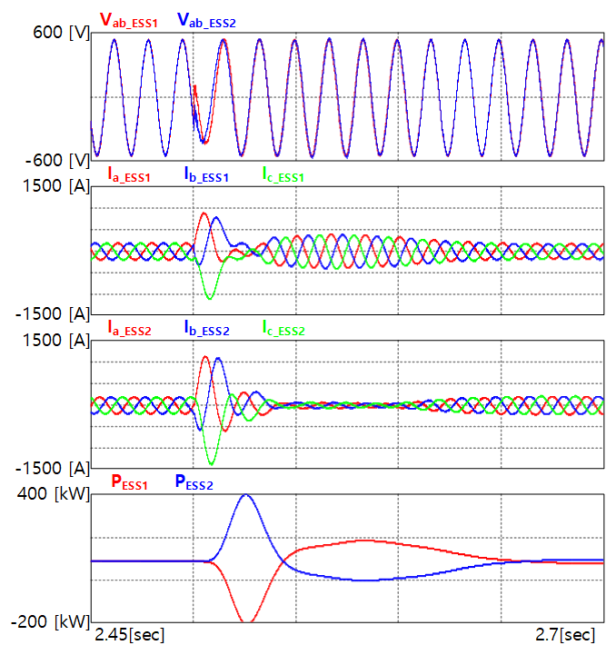 2.5초 이후에 ESS2의 ab 선간전압(Vab_ESS2)보다 위상이 느려진다. 즉, 2.5초 이후에는 ESS2 제어기에서 출력하는 전압 위상각이
