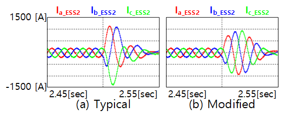 그림 10은 전형적인 GFM 제어기를 적용한 시뮬레이션 결과이다. ESS1의 위상각이 90° 느리게 이동하기 때문에 (-)로 감소하던 ESS1의 ab 선간전압(Vab_ESS1)이