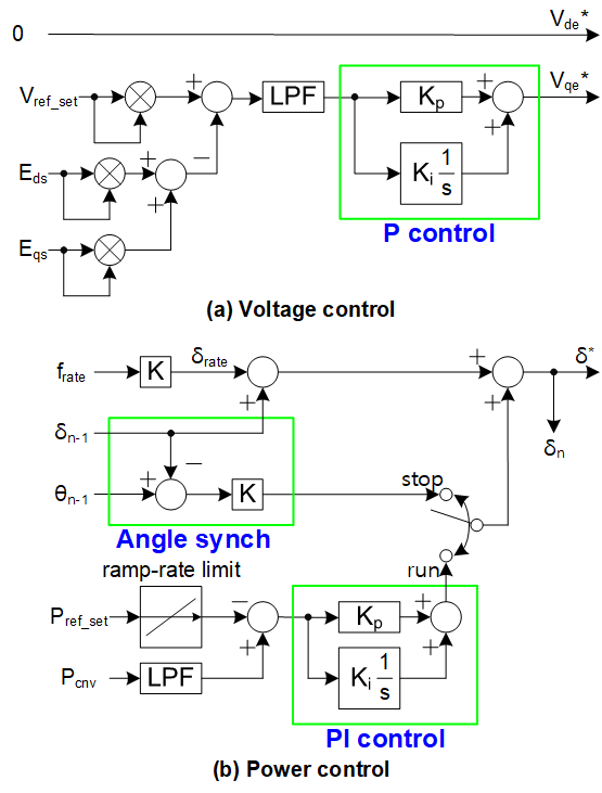 전형적인 GFM 제어기는 그림 3과 같다. GFM 제어기는 출력하는 전압의 크기와 위상각을 제어한다[4],[9-10].