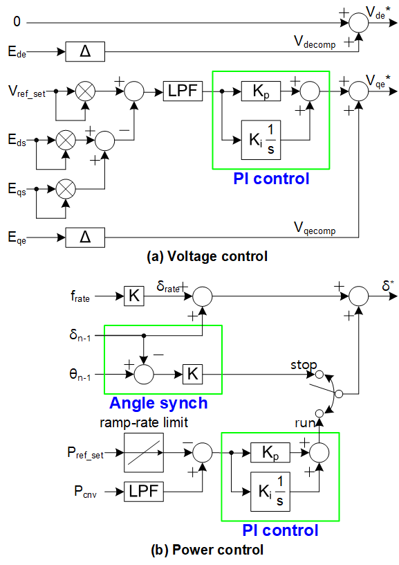전압 제어기는 d축과 q축 전압을 구분하여 제어하며, d축 전압(Vde*)은 ‘0’으로 유지하고 인버터의 출력단에서 측정된 전압의 크기(Eds와 Eqs로부터