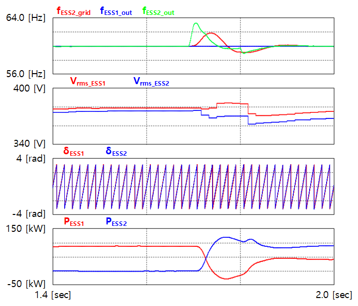 그림 9는 GFM 제어에 의해서 유효전력이 제어되는 것을 보여준다. ESS2의 유효전력 기준값을 0kW에서 90kW(1.7초)로 변경했다. ESS2의 주파수