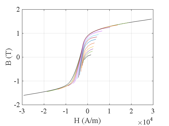 또한 사용된 해석 프로그램에서는 재료에서 얻은 히스테리시스 루프의 하강 곡선만을 사용하여 이를 표현한다. 그림 4는 해석에서 사용한 재료의 히스테리시스 루프를 보여준다. 해석에서는 그림 4와 같은 재료의 메이저 루프부터 마이너 루프 데이터를 통해 얻을 수 있는 그림 5의 하강 곡선으로 벡터 플레이 모델을 사용하여 히스테리시스 분석에 사용된다.