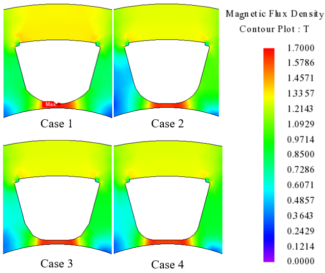먼저 케이스 별로 브릿지 부분의 포화 변화를 확인하였다. 그림 6은 브릿지 각도에 변화를 주었을 때 각 케이스 별 자속밀도 결과를 나타낸다. 그림 6에서 알 수 있듯이 각 케이스 별 브릿지 부분의 포화 영역이 다르며, 케이스 번호가 증가할수록 포화영역이 증가함을 확인할 수 있었다. 본 논문에서