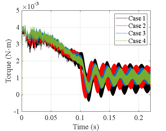 히스테리시스 토크만 남게 되며, 동기속도에 진입 시 헌팅 현상과 함께 부하 토크에 수렴하는 특징을 가진다 [5]. 이러한 히스테리시스 전동기의 특징은 선행 연구를 통해 입증되었다 [6]. 그림 7은 브릿지 각도를 변경한 4가지 케이스의 토크 해석 결과이다.