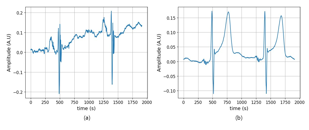 결과, 기저선 드리프트 잡음으로 인해 신호의 크기(magnitude) 위치가 기울어지거나 변동하는 현상이 관찰되었다. 기저선 잡음은 ECG 신호 분석의