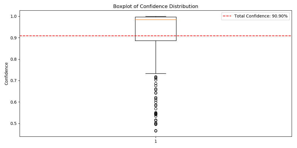 From the Figure 5, the dotted line 90.90% in the left box plot may represent the average confidence