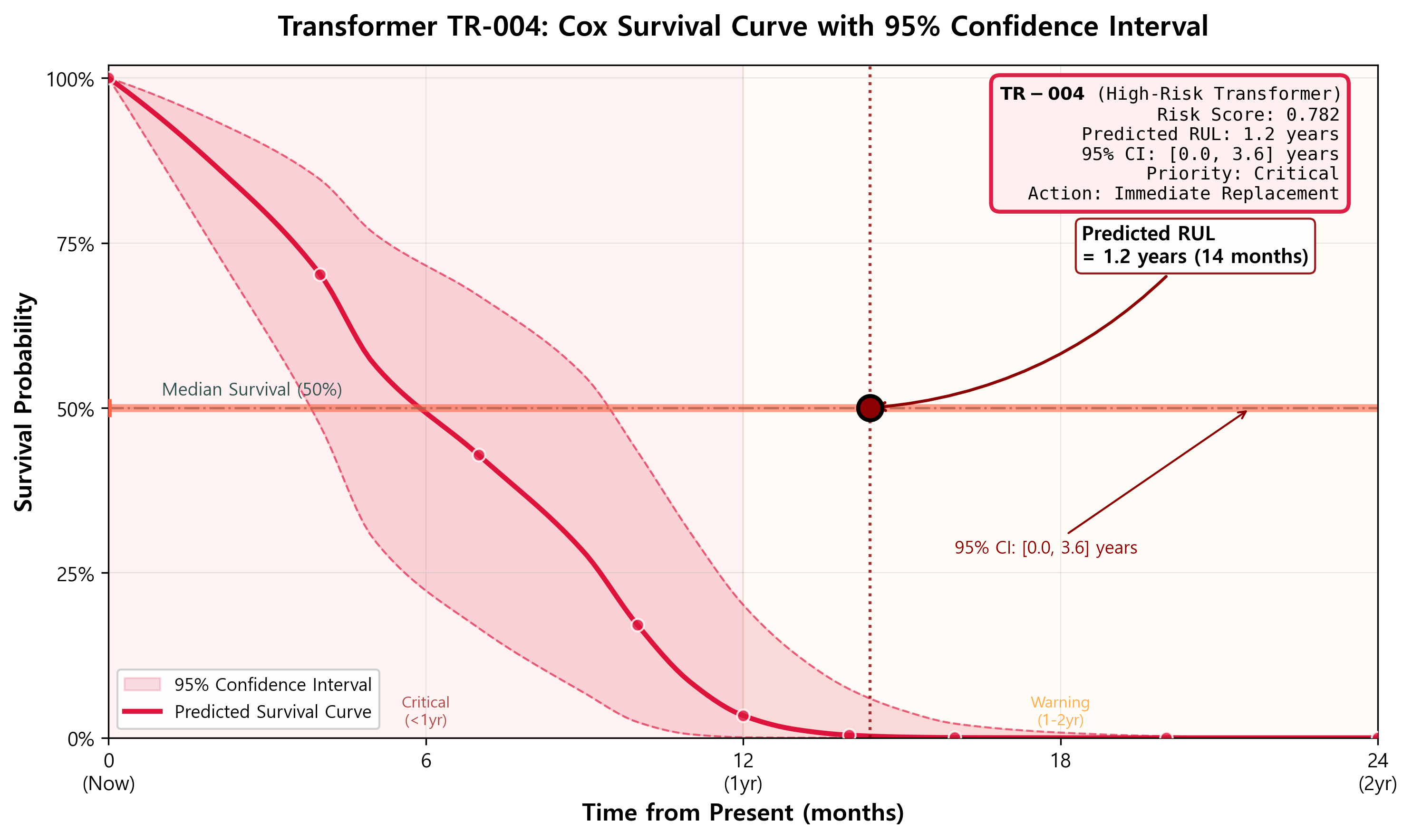 그림 4는 고위험 변압기 TR-004의 생존 확률 곡선과 95% 신뢰구간을 보여준다. 제안 모델은 해당 변압기의 잔여수명을 1.2년으로 예측하였으며, 95%