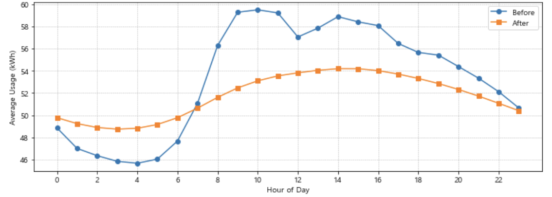 또한, 시간대별 감축량 비교 분석을 통해 예측값이 실제 감축 패턴을 잘 반영하고 있으며, 국내 평균 부하 곡선과의 비교를 통해 현실적인 적용 가능성을