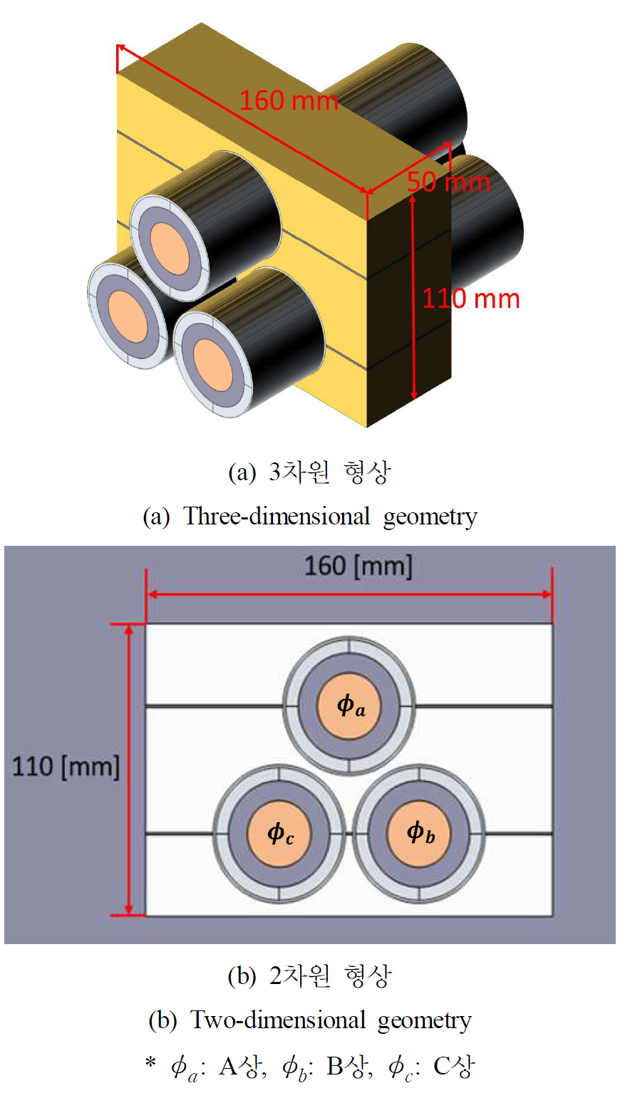 해석을 진행하였다. 케이블에 사용된 변수는 [표 1]에 나타내었다. 해석 모델의 부하 전류는 국내 주요 제조사 사양서에 명시된 허용전류 범위(약 600~700 A)를 반영하여 700 A의 실효값과