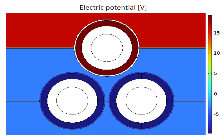전압 성분인 19.3 V와 전기장에 의한 시스 전압 성분인 0.055 V의 합인 19.4 V를 소스로 설정하고, 시스에 인가하였다. 그림 7은 부유도체에 나타난 유도전압 분포이다. 해석 결과 위 상이 0도일 때 부유도체가 가질 수 있는 최대 유도전압이 16.9 V로 계산되었다. 정리한