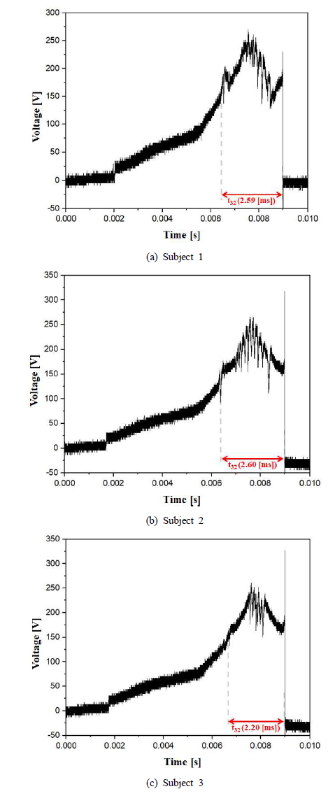 상태로 t32는 2.60 [ms]이다. Subject 1과 Subject 2를 비교하면 아직까지 열가스 흡착에 의해 과전류 소모 시간의 변화는 없는
