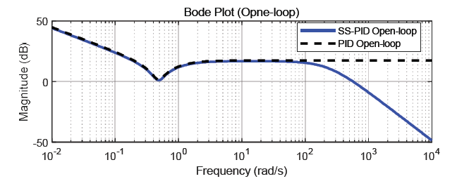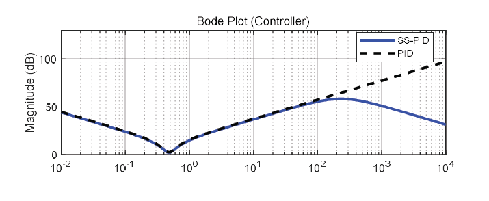 12]. ๊ทธ๋ฆผ 1์ ์ ์๋ BLDC๋ชจํฐ์ ๋ง๊ฒ ์ค๊ณ๋ PID์ SS-PID์ ๋ณด๋ ํฌ๊ธฐ์ ๋์ด๋ค. PID์ ๋น๊ตํ์ฌ SS-PID๋ ๊ณ ์ฃผํ์์ ๊ทธ ํฌ๊ธฐ๊ฐ ๊ฐ์ ๋๋ ๊ฒ์