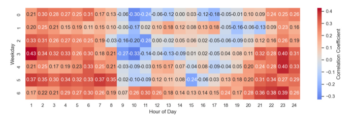 그림 16. 재생에너지 발전량과 SMP의 요일-시간별 부분 상관계수