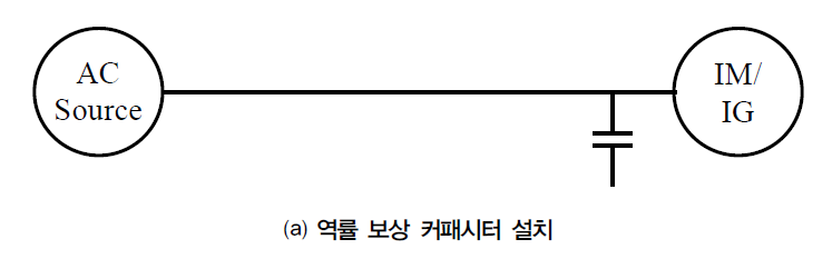앞에서 설명한 바와 같이, 소용량 유도기의 경우에는 전원과 유도기 사이의 역률을 개선하기 위해 그림 3(a)와 같이 커패시터와 같은 간단한 역률 보상 장치 설치가 유효하고 대용량 유도기의 경우에는 그림 3(b)와 같이, 부하 또는 발전량 변동에 능동적으로 대응이 가능한 STATCOM과 같은 능동형 보상 장치를 사용하는 것이 더 효과적이다[13].