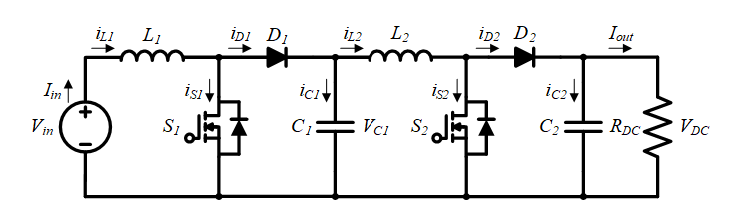 다양한 고승압 DC–DC 컨버터 중 그림 3의 Cascaded Boost Converter (CBC)의 경우 두 개의 BC를 직렬 연결한 구조로써 타 토폴로지 대비 상대적으로 적은 소자 수로도