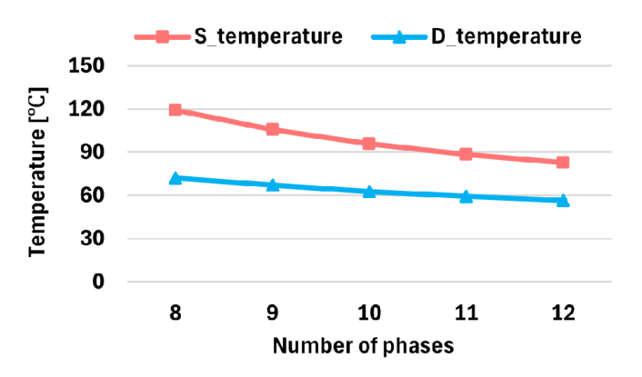 이를 위해 표 2의 설계 사양을 기반으로 상 수 변화에 따른 부피, 효율 및 접합 온도를 종합적으로 고려하여 최적의 상 수를 결정하고, 55kW급 다상 인터리브드